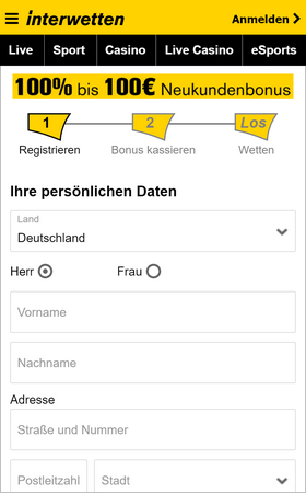 - Über Wettbasis anmelden: Schon von Interwetten überzeugt? Dann steht der Registrierung ja nichts mehr im Wege. Das kannst du gleich über einen der zahlreichen Wettbasis-Links erledigen.