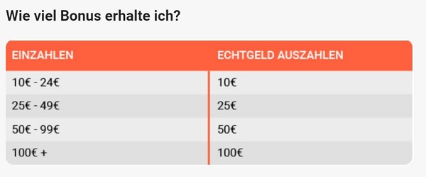 - Ersteinzahlung überlegen: Die Ersteinzahlung entscheidet über die Höhe des Bonus und den Gesamtumsatz im Rahmen der Umsetzungen. Wenn ihr zum Beispiel maximal 50 € Verlust verschmerzen könnt, solltet ihr nicht mehr einzahlen, auch wenn der Maximalbonus 100 € beträgt.