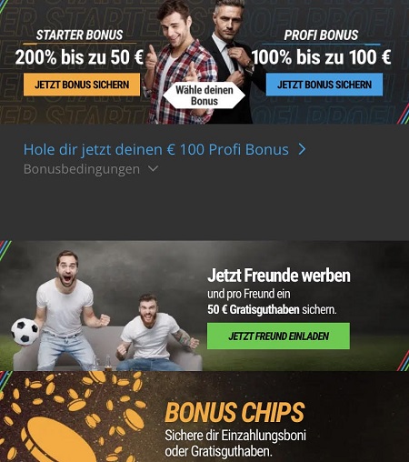 - Während der Ersteinzahlung für Starter Bonus oder Profi Bonus entscheiden.