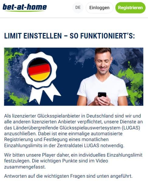 Das LUGAS Limit ist pro auf 1000 Euro festgesetzt und soll eine Maßnahme zur Suchtprävention sein. Jeder Spieler kann somit nicht mehr als 1000 Euro pro Monat auf sein Wettkonto einzahlen. Eine Erhöhung des Limits ist jedoch möglich.