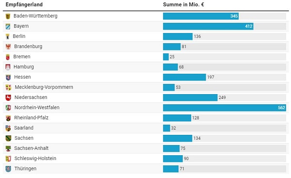 Nordrhein-Westfalen bekam mit 838 Mio. € die meisten Steuern aus Sportwetten aller Bundesländer. Auf Platz zwei folgt Bayern mit 616 Mio. € seit 2012. Der dritte Platz geht an Baden-Württemberg mit 516 Mio. €. Schlusslicht im Wettsteuer Ranking ist Bremen mit Sportwetten Steuer Einnahmen von 38 Mio. €.