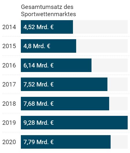 2014 lag der Gesamtumsatz der Sportwetten in Deutschland bei 4,52 Mrd. €. 2019 lag der Umsatz schon bei 9,28 Mrd. €. 2021 war ein Rekordjahr für Sportwetten in Deutschland mit einem Gesamtumsatz von 9,4 Mrd. €. Danach sanken die Wetteinsätze auf das Niveau von 2018 ab.