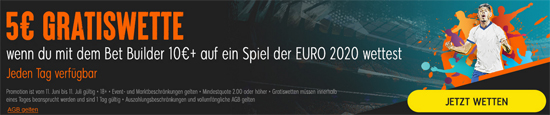 Derzeitig reiht sich auch 888Sport in die Riege der Sportwetten Anbieter ein, die zur Fußball EURO mit einem schönen EM Freebet Angebot glänzen können. Anlässlich der Europameisterschaft bietet 888Sport Tag täglich die Möglichkeit, sich 5 € gratis zu holen. Die 5 € EM 888Sports Gratiswette gibt’s, wenn man mit dem Bet Builder 10 €+ auf die EURO 2021 wettet.