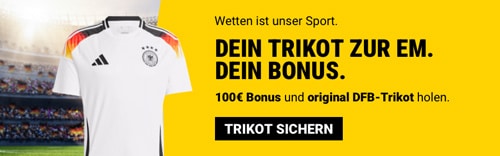 Aktuell hat Interwetten seine Neukundenbonus Aktion im Hinblick auf die kommende Fußball Europameisterschaft 2024 etwas aufgepeppt. Neukunden erhalten ab sofort bis zum 07. Juni 2024 für ihre Registrierung beim offiziellen Partner der DFB-Elf zusätzlich zum 100 % Willkommensbonus bis 100 € noch ein Trikot der deutschen Nationalmannschaft geschenkt. Voraussetzung für die Trikot Vergabe: Es sind mindestens 50 € einzuzahlen.