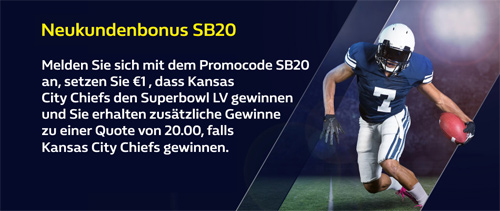 Sollten die Kansas City Chiefs das Super Bowl Finale gewinnen, wird die qualifizierende Wette mit einer Quote von 20,00 bei William Hill vergütet. Die zusätzlichen Gewinne werden innerhalb von 24 Stunden nach Auswertung der Wette gutgeschrieben.