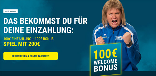 Ein weiterer Buchmacher im Bunde, der mit einem schönen Angebot für Neukunden zum Champions League Start aufwarten kann, ist natürlich Sportwetten.de. Hier gehen neue Spieler mit einem 100 % Willkommensangebot zum Kennenlernen von bis zu 100 € ins erste Wettabenteuer. Sportwetten.de gewährt die Prämie auf die Ersteinzahlung, die glatt verdoppelt wird. Dementsprechend lässt sich mit bis zu 200 € auf die CL Spiele von beispielweise Bayern, Dortmund, Leipzig oder Union Berlin wetten.