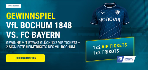 Mit etwas Glück (Losentscheid) lassen sich 1x 2 VIP Tickets für Bochum vs. Bayern (22. Spieltag der Bundesliga Saison 2023/24, Spieltermin geplant im Februar 2024) + 2 signierte Heimtrikots des VfL gewinnen. Weitere Infos siehe Sportwetten.de. Es gelten die AGB. | 18+