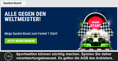 Dieses Bet at home Quoten Angebot für Formel 1 Tipps auf den Sieger steht lediglich Kunden aus Deutschland, Österreich, Polen, Montenegro, Slowakei, Schweiz, Slowenien und Kroatien zur Verfügung. Eine Kombination mit anderen Bet at home Aktionen ist nicht gestattet. Es gelten die AGB des online Wettanbieters. 18+
