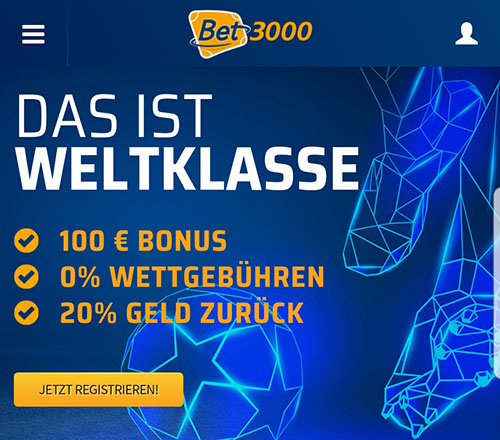Zu guter Letzt gilt es noch darauf hinzuweisen, dass Bet3000 mit einem tollen Willkommensbonus aufwartet. Die erste Einzahlung wird von Bet3000 bis zu 100€ verdoppelt. Neben dem Einzahlungsbonus hält der online Bookie weiterhin einen 20% Cash Back Bonus bereit. Es gelten die AGB. | 18+