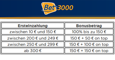 Binnen 24 Stunden nach der Ersteinzahlung versendet Bet3000 einen Bonus Code per Email, womit sich ein weiterer, zusätzlicher Sportwetten Bonus von bis zu 150€ abgrasen lässt. Also on top obendrauf zum „normalen Einzahlungsbonus“. Insgesamt winken dementsprechend bei Bet3000 für Neukunden ein Wettguthaben im Gesamtwert von 300€.