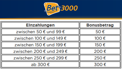 Auch bereits bestehende Kunden können sich den Bet3000 Weihnachtsbonus in Höhe von bis zu 300€ sichern. Für Bestandskunden, die bereits einmal auf ihr Bet3000 Konto eingezahlt haben, gilt für die Summe aller Einzahlungen zwischen dem 15. – 16.12.2020 (bis 23:59 Uhr) folgende Staffelung: