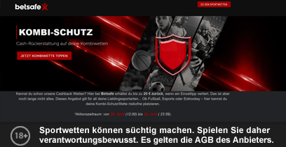 Kombiwetten Fans ausgepasst. Betsafe geht in diesen Tagen mit einer interessanten Bonus Promotion an den Start. Im Rahmen dieser Aktion obliegt es dem Sportwetten Fan mehr Sicherheit beim Abschluss seiner Kombiwetten zu genießen. Betsafe erstattet nämlich verlorene Kombiwetten bis zu 20€ zurück. Das Angebot kann mehrmals am Tag genutzt werden.