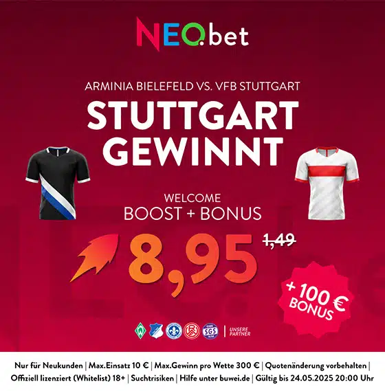 Erhöhte Quote von 8,95 anstatt 1,49 für Sieg Stuttgart mit dem unglaublichen 500% Pokal-Boost von NEO.bet