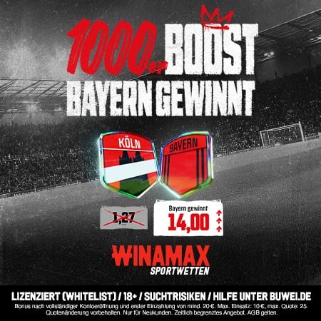 Der französische Online Buchmacher Winamax bietet zum Match zwischen Köln und Bayern ebenfalls eine Boost-Aktion an. Durch die 1000er-Promo steigt der reguläre Wert von 1,27 auf 14,0. Wie ihr den Winamax Quotenboost nutzen könnt, zeigt die folgende Anleitung: