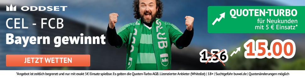 Doch das war noch nicht alles: Für deine Celtic – Bayern Wetten haben wir noch ein Ass im Ärmel. Neukunden können sich auf einen Celtic – Bayern Quotenboost freuen. Mit dem Quoten-Turbo könnt ihr statt mit einer Quote von 1,36 (Quotenänderungen möglich) mit der Turbo-Quote von 15,0 auf einen Sieg der Bayern gegen Celtic tippen.