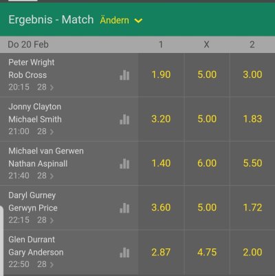 | 20.02./20:15 | Peter Wright - Rob Cross 7:5 | 3 | |