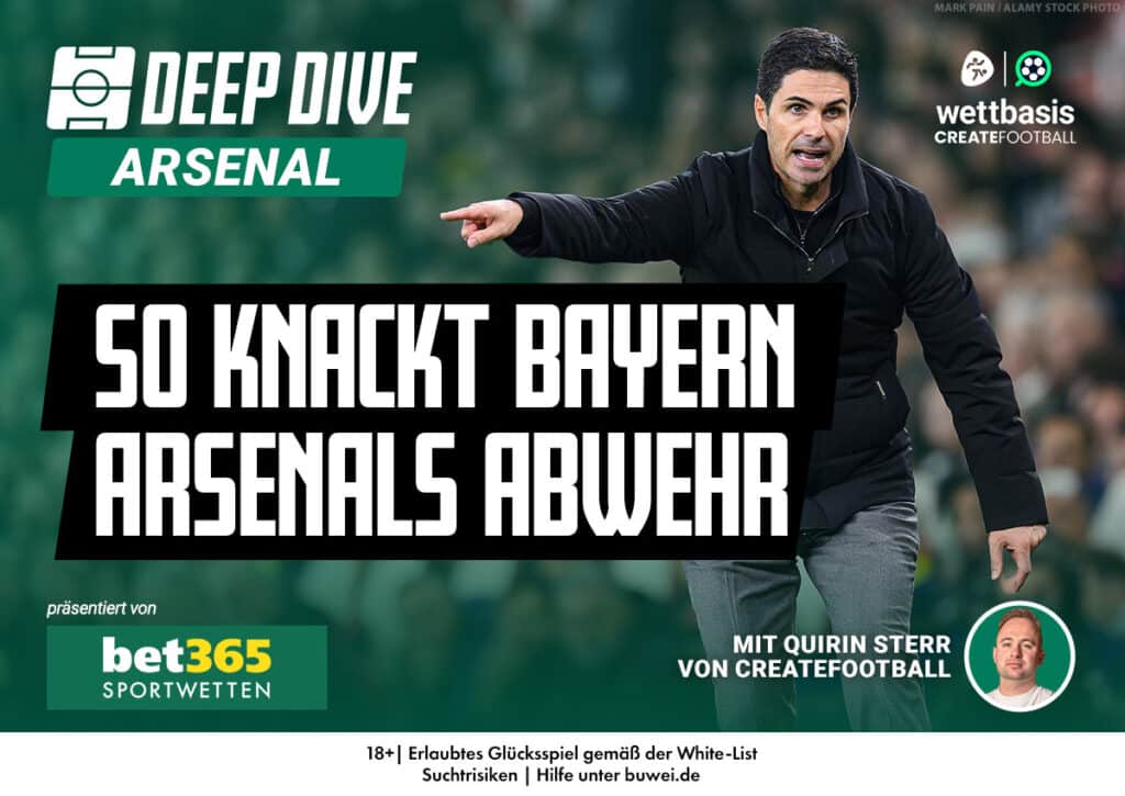 Daten-Experte Quirin Sterr von CREATEFOOTBALL analysiert im YouTube-Video exklusiv für die Wettbasis und bet365, welcher Gegner den FCB mit Arsenal erwartet, was die Spielweise der Gunners ausmacht, wer die Schlüsselspieler sind und welche „Keys to Win“ es für Bayern zu berücksichtigen gilt.