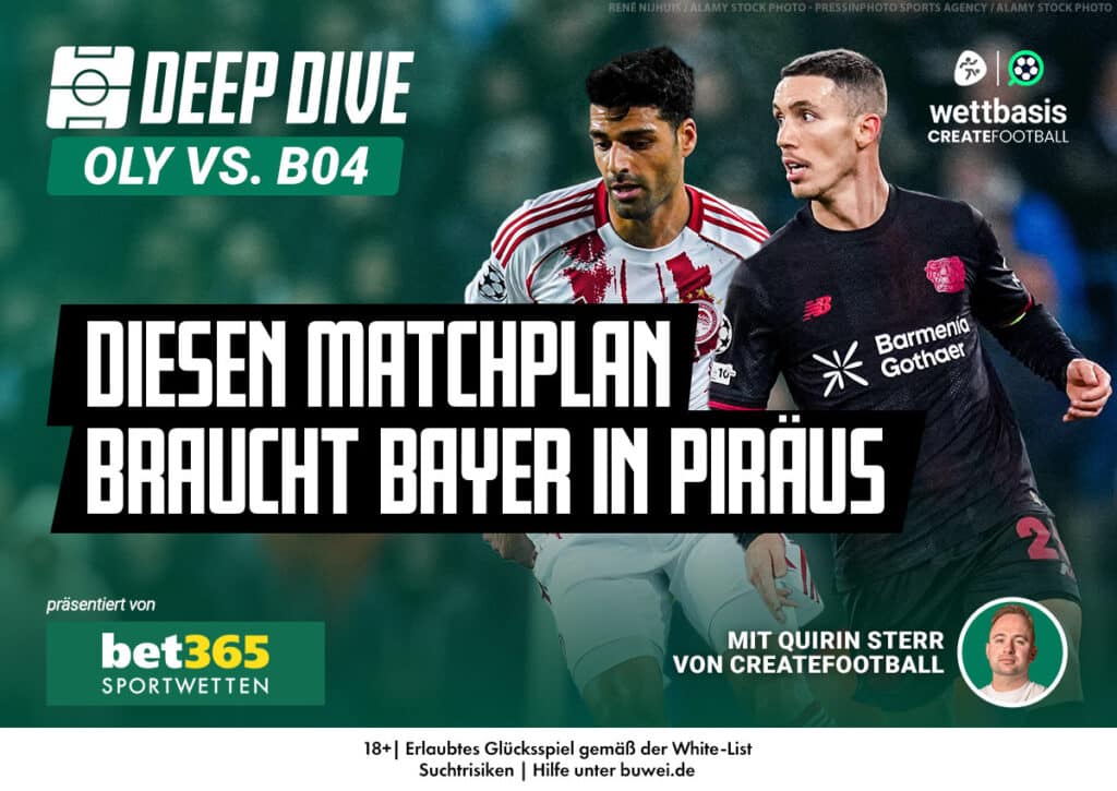 Daten-Experte Quirin Sterr von CREATEFOOTBALL analysiert im YouTube-Video exklusiv für die Wettbasis und bet365, mit welchem Matchplan Leverkusen bei Olympiakos Piräus auftreten sollte, wer im Kader der Griechen den Unterschied ausmachen kann und welche Keys to Win für die Werkself zum Erfolg führen.