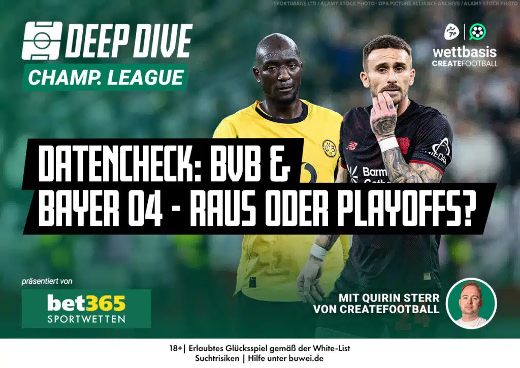 Daten-Experte Quirin Sterr von CREATEFOOTBALL analysiert im YouTube-Video exklusiv für die Wettbasis und bet365 die Ausgangsposition des BVB und Leverkusen, die Herangehensweise der Gegner und die Keys to Win gegen Inter Mailand bzw. Villarreal.