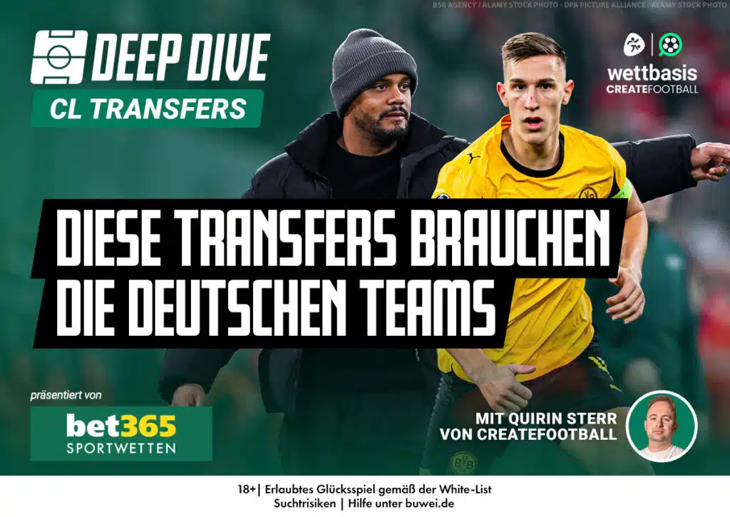 Video: Host- und Datenexperte Quirin Sterr von CREATEFOOTBALL analysiert in Deep Dive, welche Transfers für die deutschen Vertreter in der Champions League Sinn machen und wo Not am Mann ist.