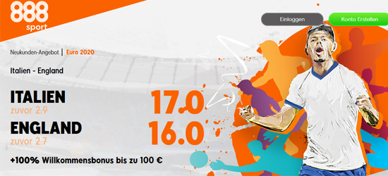 Um Siegwetten auf das EM Finale etwas lukrativer zu gestalten, boostet der Wettanbieter 888Sport die Italien – England Quoten. Ein Sieg der Italiener wird mit einer Megaquote von 17,00 anstelle der klassischen 2,90 bewertet. Wettinteressierte, die England den ersten EM Titel zutrauen, dürfen sich auf eine Hammerquote von 16,00 freuen (Quotenstand: 09.07. 08:00 Uhr). Zudem wird Neukunden weiterhin ein Einzahlungsbonus von 100 Prozent bis zu 100 € geboten.
