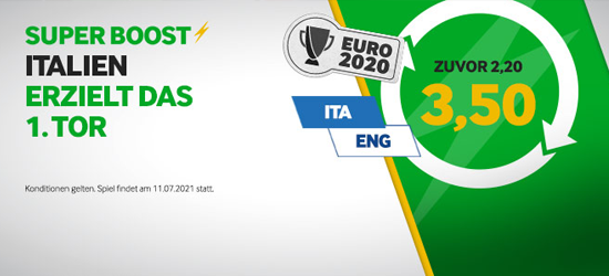 Bei Betway wird der EM Wettmarkt „Italien erzielt das 1. Tor“ mit einer Megaquote von 3,50 bewertet. Somit wurde die klassische Quote von 2,20 deutlich aufgewertet. Es gilt jedoch zu beachten, dass die Quoten Schwankungen unterliegen und sich durchaus verändern können. Tippfreunde, die sich eine gute Quote für das EM Endspiel sichern wollen, sind bei Betway dementsprechend gut aufgehoben.