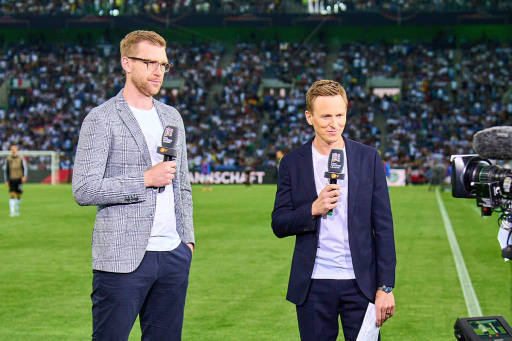 Zu ihnen gesellen sich Co-Kommentator Hanno Balitsch, DFB-Reporter Sven Voss auf Herzogenaurach und Lena Kesting als Reporterin für die Interviews im Stadion.