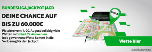 Für jedes Tor, das am 1. Spieltag der Bundesliga (18.08.2023 bis 20.08.2023) erzielt wird, wächst der Jackpot um 2.000 € (max. Jackpot beträgt 60.000 € – 30 Tore). Die Jackpot Ziehung findet am 21.08.2023 um 14:00 Uhr statt.