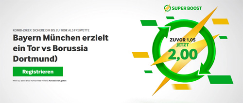 - Wettmarkt auswählen und Bayern Dortmund Quoten Wett-Boost nutzen.