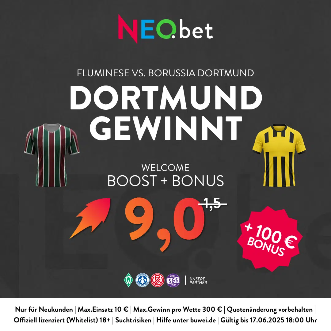 Für den BVB beginnt die Klub WM in der Gruppe F am heutigen Dienstag (17.6., 18:00 Uhr) mit dem Aufeinandertreffen gegen Fluminense. Passend dazu warten spannende Boni wie Boosts und Freebets. In diesem Beitrag präsentieren wir euch die vielversprechendsten Promotions für die Fluminense vs. Dortmund Quoten. Das Top-Angebot ist der 500 % Boost von NEO.bet für den Sieg von Borussia Dortmund.