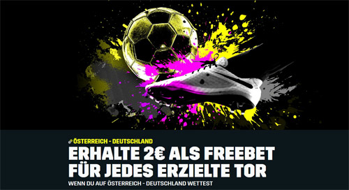 All jene, die die Teilnahmebedingungen erfüllen, erhalten eine 2 € Freebet für jedes erzielte Tor im Spiel Österreich vs. Deutschland. Die Werbeaktion ist nur für berechtigte Kunden verfügbar, die mindestens 5 € auf ihr DAZN Bet Konto eingezahlt haben, bevor sie die Qualifizierende Wette dieser Werbeaktion abgeben. Weiterführende Infos zum Angebot sind direkt bei Sportwetten Anbieter zu finden. Es gelten die AGB. | 18+