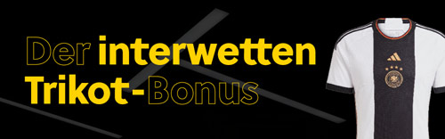 Neue Kunden, die mit einer Registrierung bei Interwetten beispielsweise liebäugeln, erhalten zum Start ein 100 % Willkommensangebot zum Kennenlernen von bis zu 100 € auf die erste Einzahlung. Obendrein legt der Buchmacher mit deutscher Wettlizenz zusätzlich gratis noch ein Trikot der deutschen DFB-Elf rauf. Die deutsche Nationaltrikot-Aktion läuft nur noch bis zum 21.11.2023.