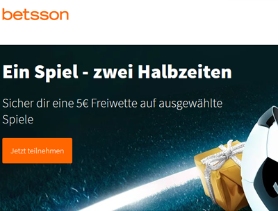 Insofern die eben genannten Bedingungen erfüllt wurden, gewährt Betsson eine 5€ Gratiswette. Die Betsson Freiwette kann nur auf die 2. Halbzeit desselben Duells gewettet werden. Nur Märkte mit einer Mindestquote von 1,50 qualifizieren sich für den Wettabschluss. Sollte die Gratiswette bis zum Ende der zweiten Hälfte nicht gespielt werden, verfällt diese.