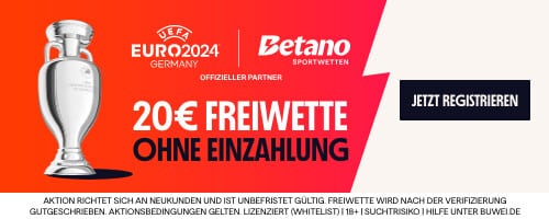 Bei Betano gibt’s für Neukunden noch immer eine 20 € EM Gratiswette, wenn nach der Registrierung das neu eröffnete Wettkonto vollständig verifiziert wird. Außerdem ist bei der Registrierung der Betano Promo Code EURO24WB zu verwenden. Die Gutschrift der EM Freebet erfolgt in der Regel am Tag nach der Verifizierung. Eine Einzahlung ist nicht erforderlich. Dementsprechend handelt es sich um einen schönen NO DEPOSIT BONUS, der definitiv genutzt werden sollte. Doch das war längst noch nicht alles.