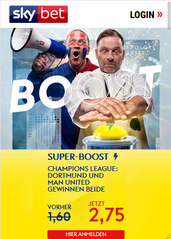 Pünktlich zum neuen Champions League Spieltag hat SkyBet für seine Kunden einen durchaus attraktiven VIP Quoten Boost im Gepäck und erhöht die Kombi-Tipp-Quote für „Dortmund & Man United gewinnen“. Dementsprechend wetten Skybet Kunden mit einer deutlich erhöhten Wettquote. Für „BVB & Man United gewinnen“ gibt’s bei Skybet nun eine 2.75 statt 1.60 (Achtung: Die normale Quote kann sich aufgrund von Quotenschwankungen jeder Zeit ändern!). Das kann ich sehen lassen.