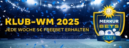 Im sogenannten Merkur Bets Klub wartet auf Kunden des Wettanbieters jede Woche eine 5 € Freebet, die mit Klub-WM Wetten eingelöst werden kann.