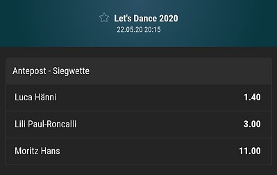 Dass dies auch bei den Fans vor den heimischen Bildschirmen nicht bis zum Ende klappen würde, zeigte sich in der Zuschauerabstimmung im Halbfinale. Dort schied Tijan Njie aus und musste für Underdog Moritz Hans weichen. Klar ist jedenfalls, dass Luca Hänni bei Let’s Dance 2020 Lili noch zu den Favoriten gehört, aber von Luca verdrängt wurde. Erfolgreiche Wetten auf den Schweizer Sänger als Gesamtsieger werden daher inzwischen mit dem 1,4-fachen Einsatz vergütet.