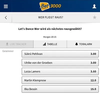 Ein Tipp auf Ulrike von der Groeben wird im Erfolgsfall identisch vergütet; auch Loiza Lamers befindet sich den Buchmachern zufolge in Gefahr, hat laut leicht erhöhten Quoten von 3,50 aber etwas bessere Chancen, weiterhin das Tanzbein schwingen zu dürfen.