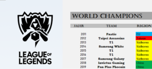 Nach dem erstaunlichen Sieg der Taipei Assassins bei den zweiten Worlds, feierte T1 im Jahr 2013 den ersten Weltmeister-Titel und holte damit die Trophäe nach Südkorea. Damit begann die Vorherrschaft Südkoreas im internationalen Vergleich und die Teams der LCK fuhren vier weitere Titel ein. Erst im Jahr 2018 endete die Dominanz Südkoreas und Europa sowie China erhoben sich. In den beiden vergangenen Jahren begegneten sich stets die LPL und die LEC im Endspiel der Worlds, wobei der chinesische Vertreter in beiden Duellen siegreich blieb.