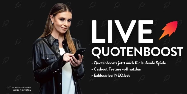Wettanbieter NEO.bet ist mittlerweile mit seinen Quotenboosts (erhöhten Quoten) breit aufgestellt. Überall wo die Boost-Rakete auftaucht, handelt es sich um einen NEO.bet Quotenboost. Neuerdings gibt es auch sogenannte Welcome Boosts für Neukunden in Höhe von 500%.