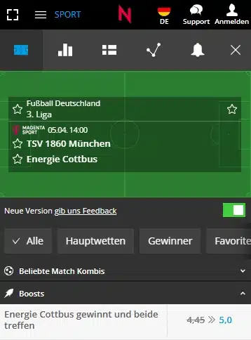 Der Wettanbieter beschränkt sich nicht nur auf die Bundesliga, sondern verbessert auch Quoten von Begegnungen in der 2. Liga und sogar der 3. Liga. Was die Wettmärkte angeht, zeigt sich das Angebot reichhaltig. Hier ein paar Beispiele: