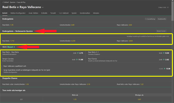 Anmerkung – HINWEIS: Alternativ sind auch im Wettangebot eines selektierten Matches die Bet365 Quotenboosts ersichtlich, insofern es denn welche zur Auswahl geben sollte. Dabei kommen die Rubriken „Endergebnis – verbesserte Quoten“ und „Wett-Boost“ zum Einsatz. Somit ist dem Kunden direkt ersichtlich, ob zum gewünschten Spiel verbesserte Quoten oder ein Wett-Boost verfügbar sind.