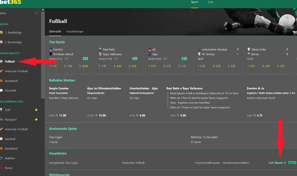 Bet365 Wett Boosts stellen das Pendant zu den doch recht niedrig ausfallenden Quoten Boosts auf das Endergebnis dar. Um einen Gesamtüberblick zu erlangen, ist z. B. in der linken Navigation die Sportart „Fußball“ zu selektieren.