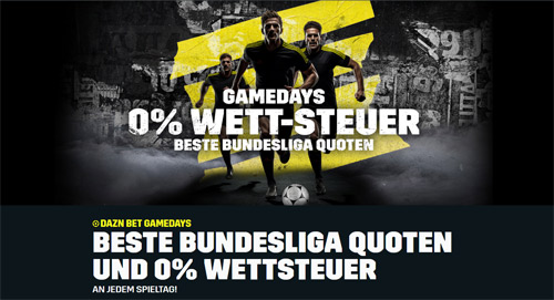 Jetzt bei Dazn Bet steuerfrei auf die Bundesliga mit 0 % Marge (Sportwetten Provision) wetten! Der Newcomer mit deutscher Wettlizenz startet ab sofort seine „GAMEDAYS“ und Kunden profitieren dann jeden Freitag von 12:00 bis Sonntag 23:00 von höheren Gewinnen.