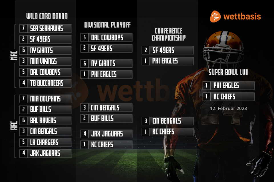 Die 12 weiteren NFL Playoff Teams spielen hingegen schon in der Wildcard Round gegeneinander. Die vier Division-Sieger aus jeder Conference, die sich fix für die NFL Playoffs qualifizieren, werden in der K.o.-Phase auf die Plätze #1 bis #4 gesetzt – je nach ihrer bisherigen Saisonbilanz.