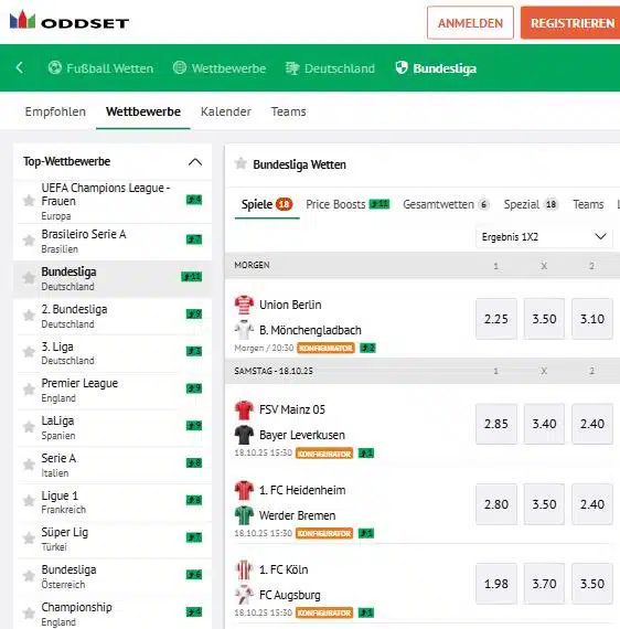 Selbstverständlich gut mit Boosts ausgestattet sind die Partien der Bundesliga und 2. Liga. Für jedes Match gibt es zumindest einen Oddset Quotenboost. Das trifft auch auf die Top-Ligen Europas, WM, EM und die jeweiligen Qualifikationsspiele zu.