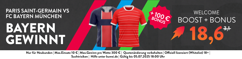 - Boost im Wettkonto aktivieren und max. 10 € auf Sieg Bayern setzen