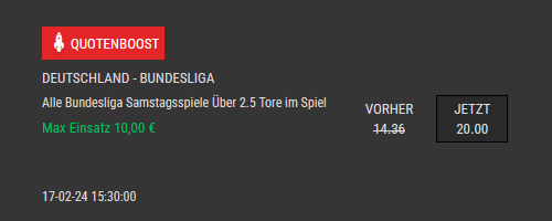 Bestandskunden bei Intertops können sich einen schönen Bundesliga Quoten Boost für die Samstagsspiele einverleiben. Für den Markt „Alle Bundesliga Samstagsspiele Über 2.5 Tore im Spiel“ gibt’s nun eine verbesserte Quote 20.0 statt vorher 14.36. Der Quotenanstieg kann sich in der Tat sehen lassen. Weitere Infos zum Bundesliga Quoten Boost sind direkt bei Intertops zu finden. Es gelten die AGB. 18+
