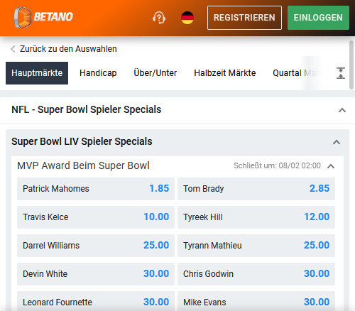 Wer seine Super Bowl Wetten bei Betano übrigens platzieren will und noch kein Wettkonto bei diesem Anbieter besitzt, kann sich über eine 20€ Betano Super Bowl Gratiswette ohne Einzahlung freuen. Es gelten die AGB. | 18+