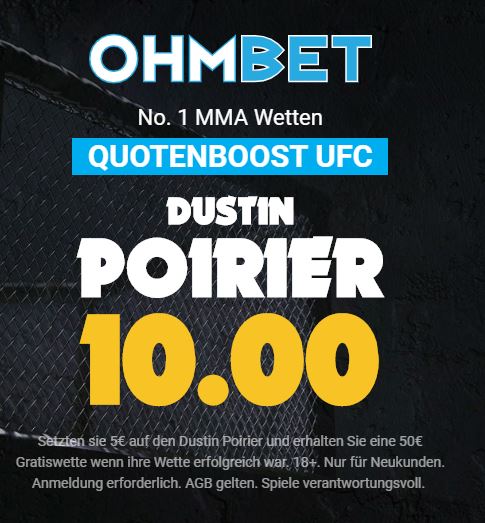Derzeit werden dafür höchste Wettquoten im Bereich der 1,45er-Marke angeboten. Wer noch kein Konto bei Ohmbet, einem der führenden MMA-Wettanbieter, besitzt, sollte sich den UFC-Quotenboost bei Ohmbet nicht entgehen lassen. Für einen Favoritensieg von Dustin Poirier wird nämlich eine 10,00-Quote angeboten.